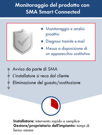 Se è necessaria la sostituzione di un dispositivo o di un componente, SMA fornisce automaticamente il relativo prodotto entro un periodo di consegna concordato, calcolato dal momento della diagnosi del guasto. La notifica tempestiva del guasto consente al gestore/proprietario dell'impianto e all'installatore di fissare rapidamente un appuntamento per la sostituzione dell'inverter o del componente interessato in tempi brevi.