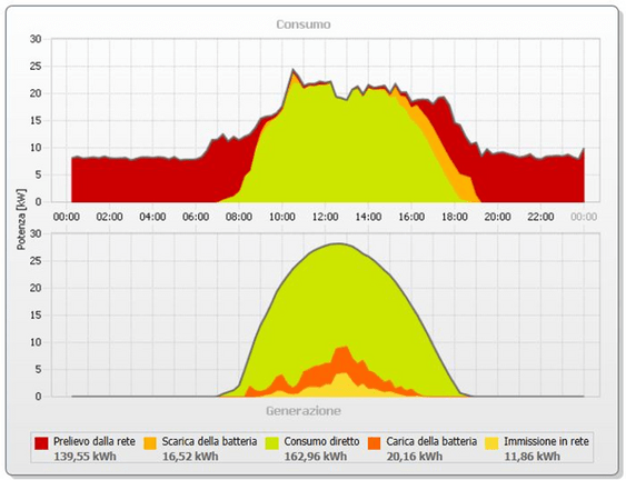 Inoltre grazie alla registrazione sul Sunny Portal i gestori dell’impianto possono accedere sempre e dovunque ai dati più importanti, con la possibilità di analizzare i valori di misurazione, oltre che di visualizzare e confrontare in modo chiaro i rendimenti anche attraverso grafici come il seguente relativo al bilancio energetico della tipica giornata lavorativa: